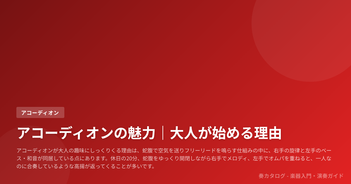 アコーディオンが大人の趣味にしっくりくる理由は、蛇腹で空気を送りフリーリードを鳴らす仕組みの中に、右手の旋律と左手のベース・和音が同居している点にあります。