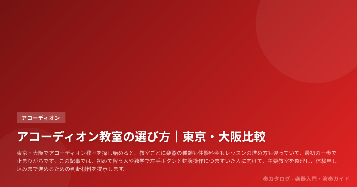 東京・大阪でアコーディオン教室を探し始めると、教室ごとに楽器の種類も体験料金もレッスンの進め方も違っていて、最初の一歩で止まりがちです。