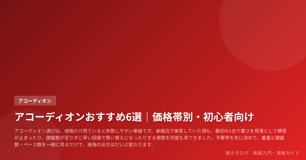 アコーディオン - Wikipedia(https://ja.wikipedia.org/wiki/%E3%82%A2%E3%82%B3%E3%83%BC%E3%83%87%E3%82%A3%E3%82%AA%E3%83%B3にある基本構造も踏まえつつ、練習を続けやすい6機種を価格帯別に絞り込みます。